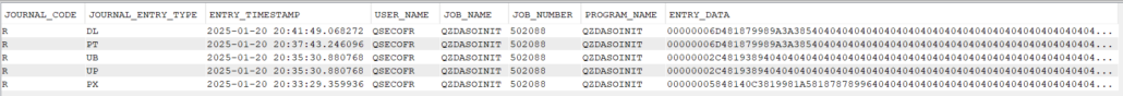 FROM TABLE (QSYS2.DISPLAY_JOURNAL(JOURNAL_LIBRARY =>'NKSQL',