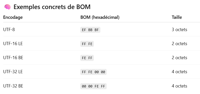 Sans BOM, certains outils devinent l’encodage… et se trompent.