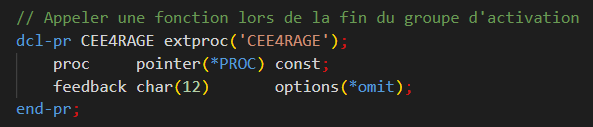 En effet, certains « nettoyages » ne peuvent pas, ou ne doivent pas, être laissés au seul mécanisme système. Certains composants nécessitent une fermeture explicite : mémoire allouée dynamiquement, connexions réseau persistantes, APIs externes, sockets, workers auxiliaires ou encore structures partagées. CEE4RAGE garantit que votre code de nettoyage sera exécuté quelle que soit la manière dont l’activation group se termine : retour normal, reclaim, exception ou même ENDJOB.